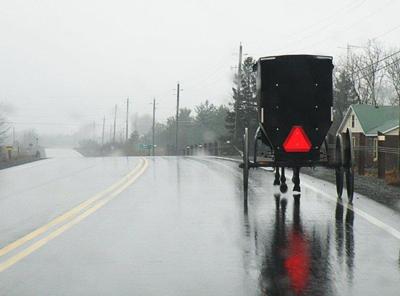 On the highway about 20 minutes north of town, we came across an Amish horse and carriage. With no one else out on such a miserable day, we were able to take a few pictures as the carriage went up the empty highway.
